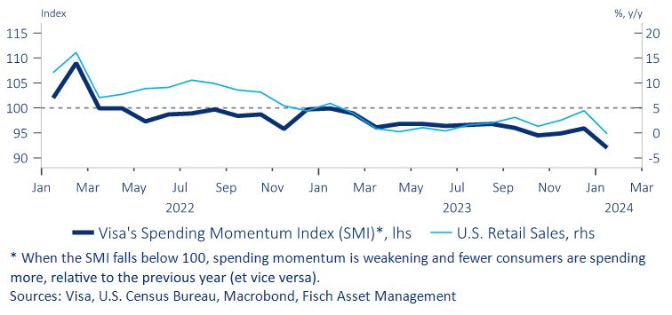 - However, this means that disappointments are increasingly likely in the form of rising interest rates and falling equity markets. This is particularly the case due to a very possible combination of higher inflation rates and a simultaneous decline in economic momentum. The latter would be due to the weakening special factors mentioned above. In any case, retail sales and credit card spending increasingly point to a weakening of the previously very robust consumer and services sector.