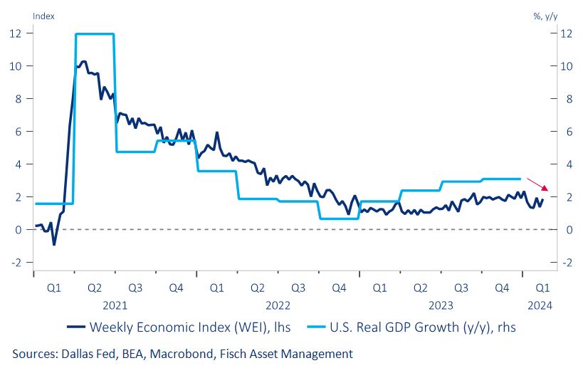 Currently, however, the WEI has weakened from 2.34% to 1.87% in the last six weeks. This is moderate, but nevertheless noteworthy. As we also expect an accelerating decline in consumer spending, which is driven by excess savings, in the coming months, this latest reversal in the WEI could signal a further slowdown in economic momentum in the US.