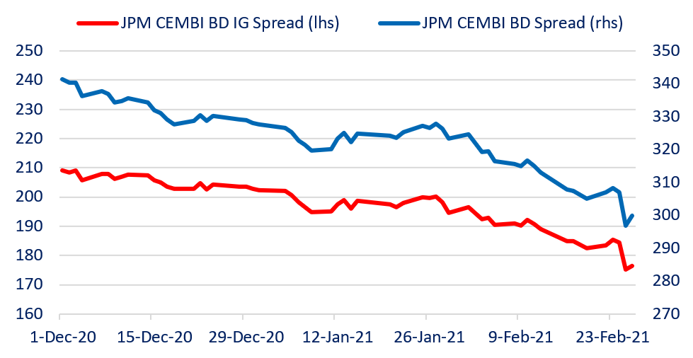 Erstens, wie Fed-Präsident Jerome Powell betonte, ist die Lage am Arbeitsmarkt immer noch angespannt. Die Beschäftigungssituation ist weiterhin stark beeinträchtigt, und nach wie vor besteht hohe Unsicherheit bezüglich der Geschwindigkeit der Erholung. Die grösseren Zentralbanken üben sich weiter in Zurückhaltung und haben in einigen Fällen bereits Andeutungen über potenzielle Reaktionen im Falle einer massiven Marktschwäche gemacht. Zweitens verlaufen die Zinskurven anderer wichtiger Währungen immer noch wesentlich flacher, und Währungsabsicherungen auf Grundlage der kurzfristigen Zinsen bleiben vergleichsweise kostengünstig. Die Renditen währungsgesicherter US-Treasuries haben sich folglich für ausländische Anleger beträchtlich verbessert und sorgen für einen gewissen Ausgleich. Letztendlich behalten wir die Zinsentwicklung und potenzielle Volatilität weiterhin genau im Auge. - Im Gegensatz zu den Zinsen ist die Risikobereitschaft insgesamt grundsätzlich positiv geblieben. Die Spreads der Schwellenländer-Unternehmensanleihen haben sich grösstenteils trotz einzelner Volatilitätsschübe als widerstandsfähig erwiesen und sich seit Dezember in allen Regionen erheblich eingeengt. Der Kreditertrag von Unternehmensanleihen ist in allen Ratingsegmenten positiv, wobei das niedriger bewertete Segment vorne liegt, weil es besonders vom günstigen Finanzierungsumfeld für Emittenten von Hochzinsanleihen und hohen Rohstoffpreisen profitiert.