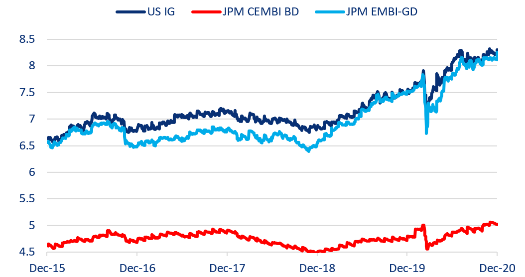 Grafik 2: Modifizierte Duration von EM Corporates (JPM CEMBI BD IG), EM-Staatsanleihen (JPM EMBIG) und US-Investment-Grade-Anleihen seit Dezember 2015
