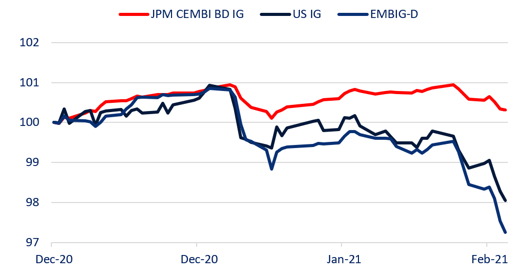 Grafik 3: Wertentwicklung CEMBI BD IG gegenüber EMBIG IG, US IG seit Dezember 2020
