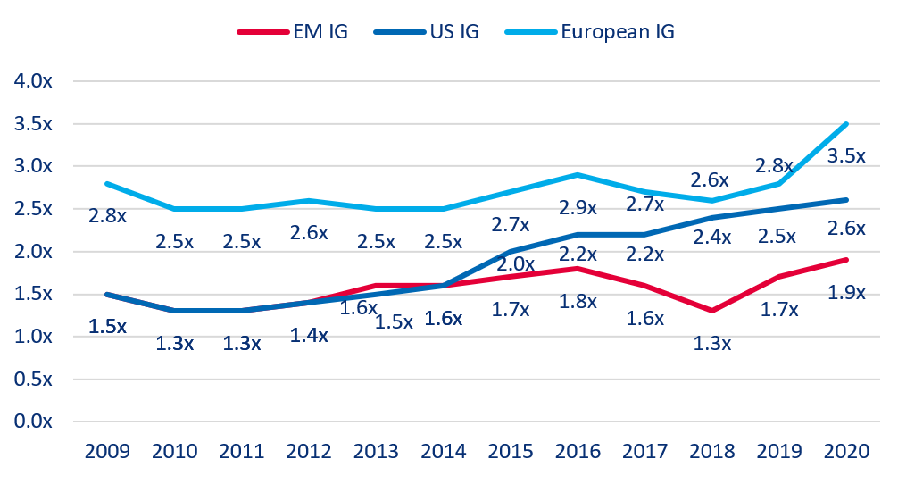 Grafik 4: Net Leverage von Investment-Grade-Unternehmen aus den EM, den USA und Europa seit 2009
