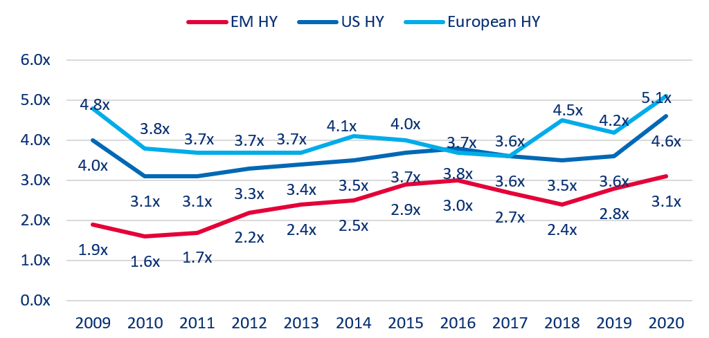 Grafik 5: Net Leverage von High-Yield-Unternehmen aus den EM, den USA und Europa seit 2009